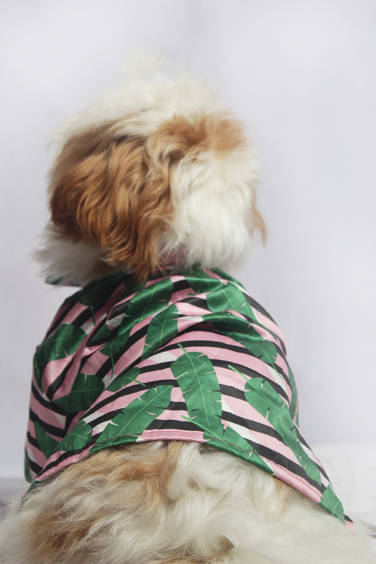 Turn your furry friend into the talk of the town with our Tropical Luxe Satin Shirt. This vibrant, silky-soft piece features bold pink-and-black stripes overlaid with lush green tropical leaves—designed to make every stroll feel like an exotic vacation.
