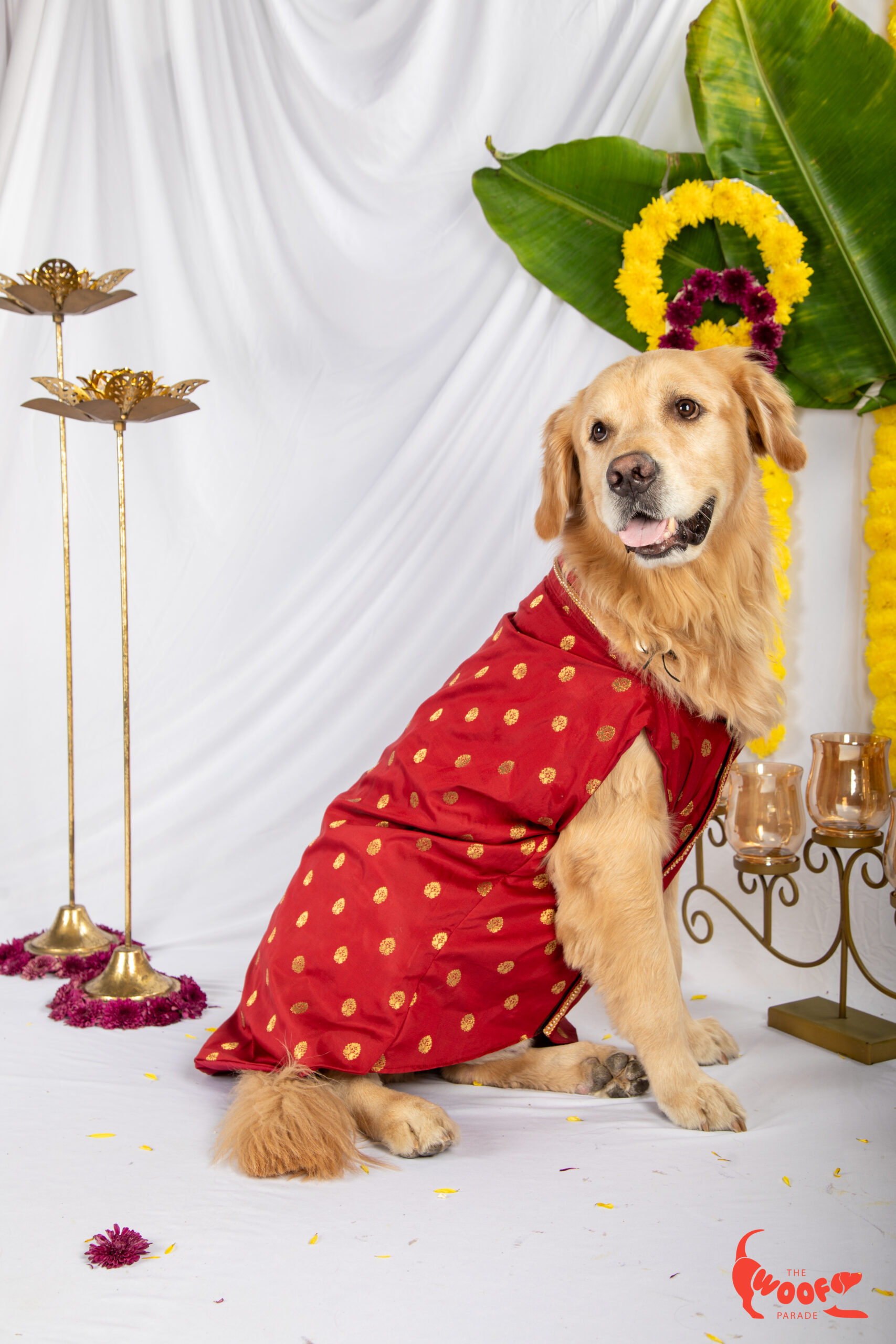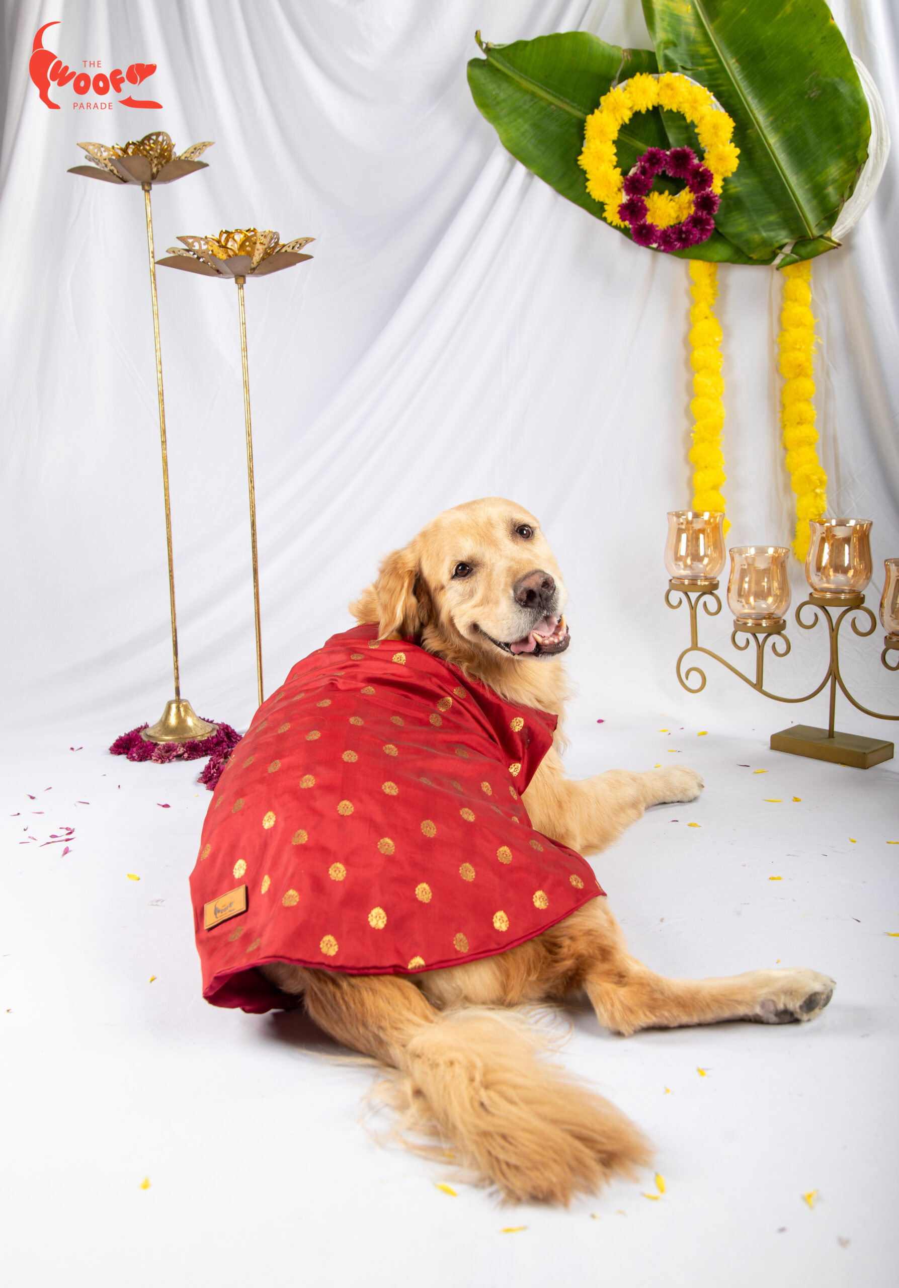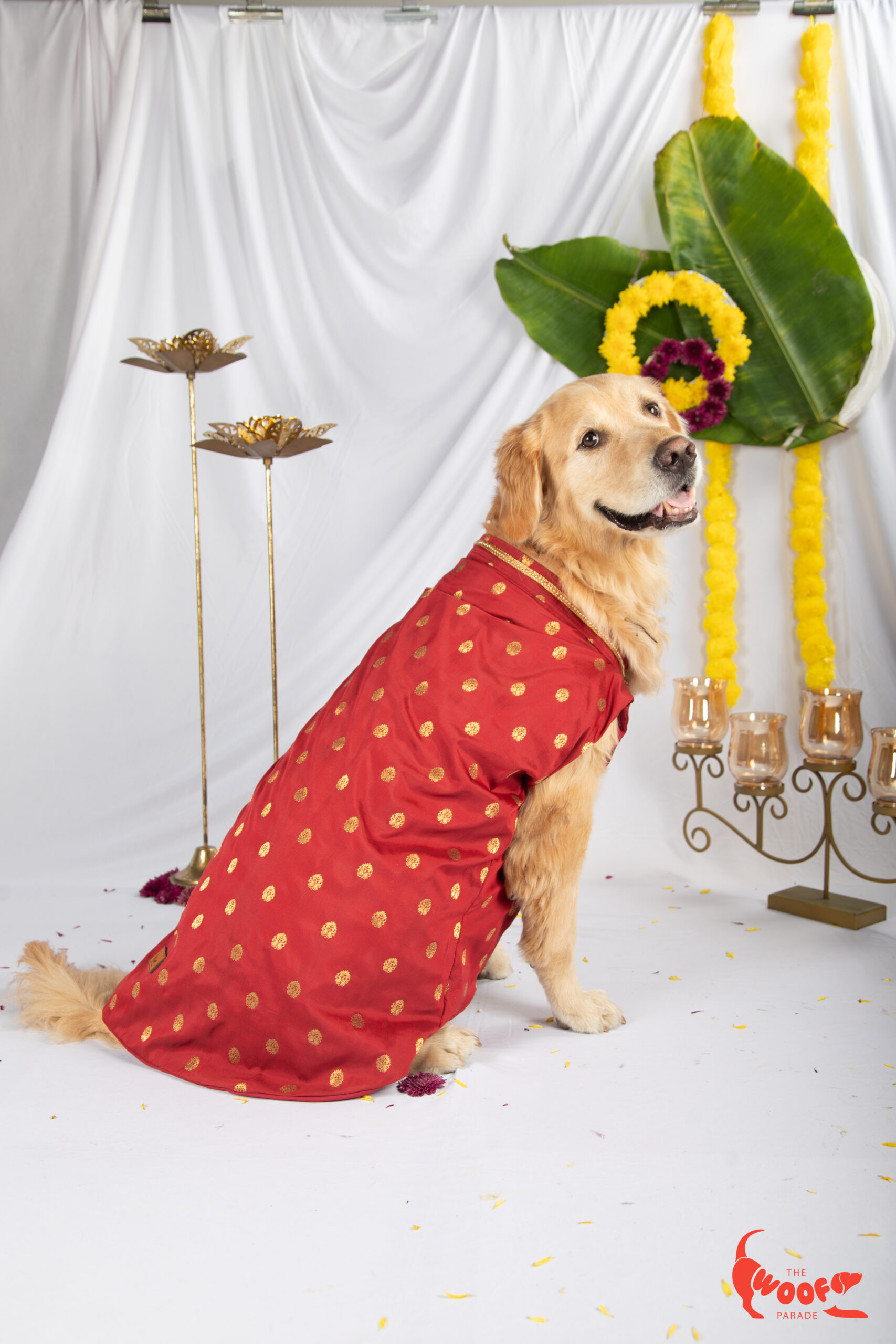 Bring royal elegance to your pet’s festive wardrobe with this stunning red Banarasi cotton silk outfit. Designed with luxurious texture and timeless charm, it perfectly blends traditional Indian craftsmanship with modern comfort. Ideal for festivals, weddings, or any cultural celebration—this outfit ensures your furry friend turns heads wherever they go.