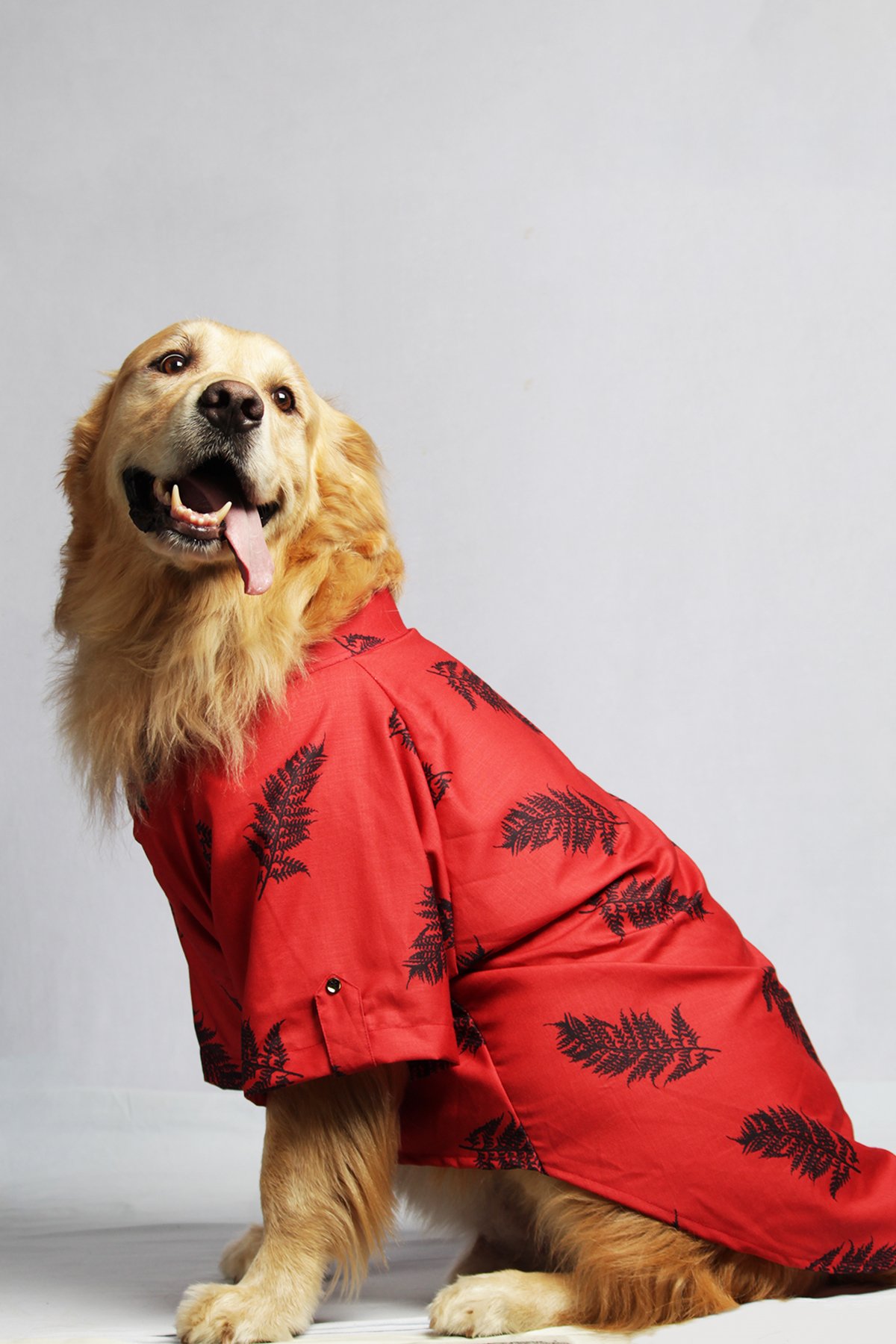 Red Regal Paw Shirt. A relaxed red shirt with a palm leaf print, made from soft, breathable cotton. Features button tab sleeves and a revere collar for the perfect warm weather outfit.